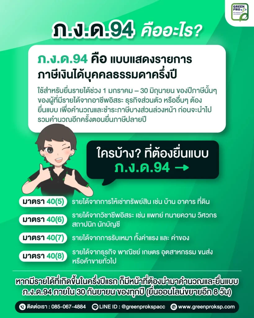 ภ.ง.ด.94 คือแบบยื่นภาษีเงินได้บุคคลธรรมดาครึ่งปี สำหรับรายได้ตามมาตรา 40(5)–(8) ที่เกิดขึ้นช่วง 1 มกราคม – 30 มิถุนายน เพื่อชำระภาษีล่วงหน้า