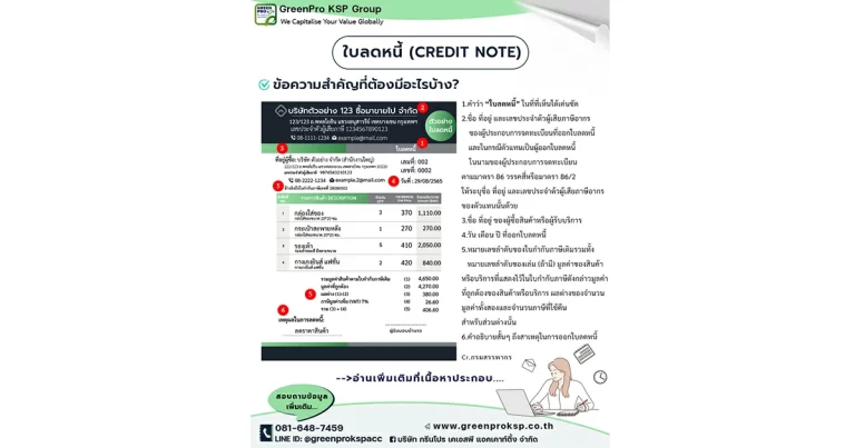 ใบลดหนี้ (Credit Note) เป็นเอกสารสำคัญในระบบภาษีมูลค่าเพิ่ม กฎหมายให้ถือว่าเป็นใบกำกับภาษีผู้ประกอบการที่มีสิทธิออกใบลดหนี้ต้องเป็นผู้ประกอบการจดทะเบียนภาษีมูลค่าเพิ่มที่ได้ออกใบกำกับภาษี จากการขายสินค้าหรือให้บริการแล้ว ต่อมาภายหลังได้เกิดเหตุการณ์ทำให้มูลค่าสินค้าหรือบริการมีจำนวนลดลงไม่ว่าทั้งหมดหรือบางส่วน เนื่องมาจากสาเหตุ สาระสำคัญของใบลดหนี้มีข้อความ ดังนี้ สอบถามข้อมูลเพิ่มเติม โทร: 081-648-7459LINE ID: @greenprokspacc เครดิตเนื้อหา/อ้างอิง กรมสรรพากร, สำนักวิชาการแผนภาษี กลุ่มบริหารการเสียภาษีขนาดกลางและขนาดเล็ก เอกสารเรื่อง ภาษีซื้อต้องห้าม ที่มา: พิ่มหนี้และใบลดหนี้ที่มา: : เอกสารเพิ่มเติม
