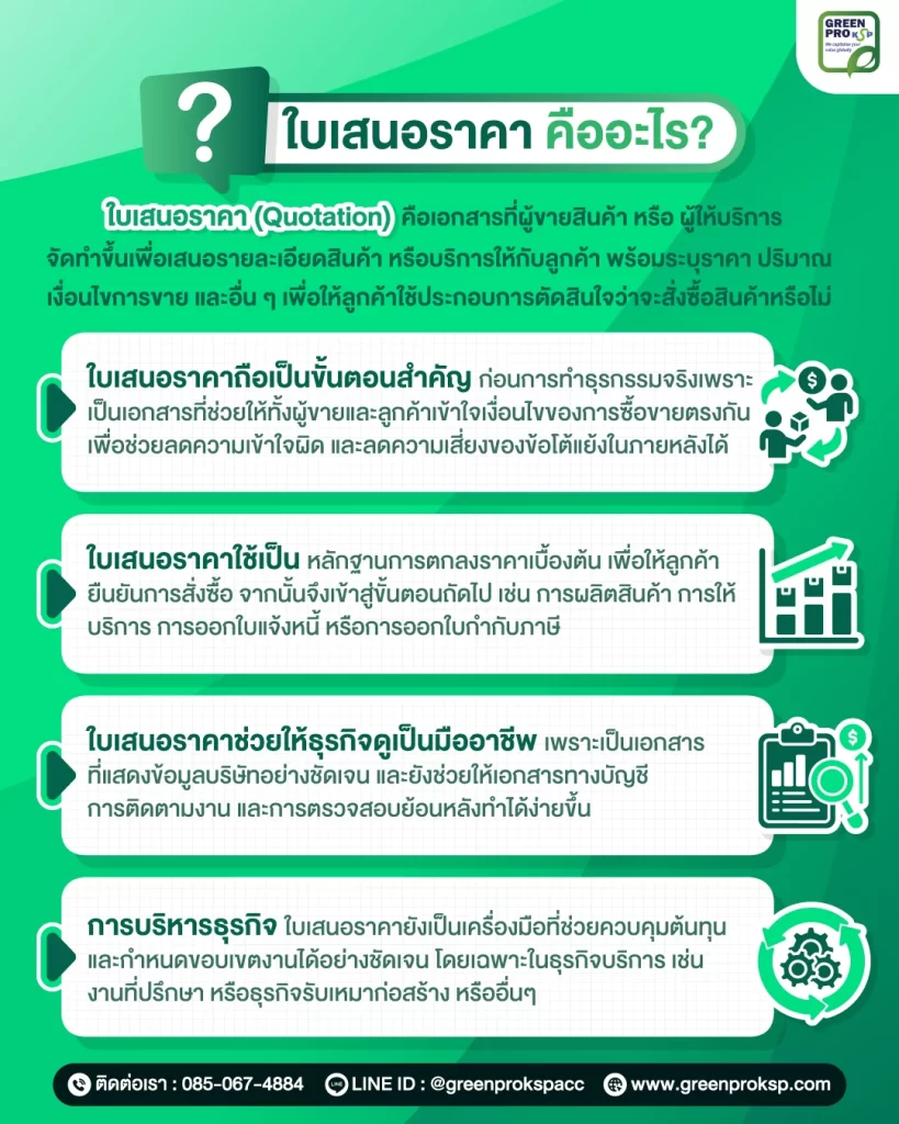 ใบเสนอราคา (Quotation) เป็นเอกสารสำคัญในกระบวนการซื้อขายที่ใช้สำหรับเสนอรายละเอียดสินค้า หรือบริการ พร้อมราคาและเงื่อนไขต่าง ๆ ให้ลูกค้าพิจารณาก่อนตัดสินใจสั่งซื้อ การจัดทำใบเสนอราคาที่ครบถ้วนและชัดเจนจะช่วยให้ทั้งผู้ขายและลูกค้าเข้าใจเงื่อนไขตรงกัน ลดความเสี่ยงของข้อผิดพลาด และทำให้การทำธุรกิจเป็นระบบมากขึ้น