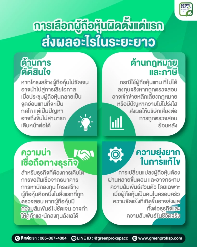 โดยสรุป การเลือกผู้ถือหุ้นผิดตั้งแต่แรกไม่ใช่ปัญหาที่เห็นผลทันที แต่เป็นความเสี่ยงสะสมระยะยาว ที่กระทบทั้งการบริหาร กฎหมาย ภาษี และความน่าเชื่อถือของบริษัท