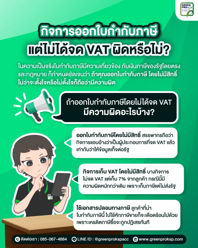 ดังนั้นถ้ากิจการยังไม่ได้จด VAT แต่ออกเอกสารใบนี้ เท่ากับว่ากำลังออกเอกสารที่กฎหมายจำกัดสิทธิ์เฉพาะบางคนเท่านั้น เหมือนใช้บัตรประชาชนของคนอื่นซึ่งผิดกฎหมาย