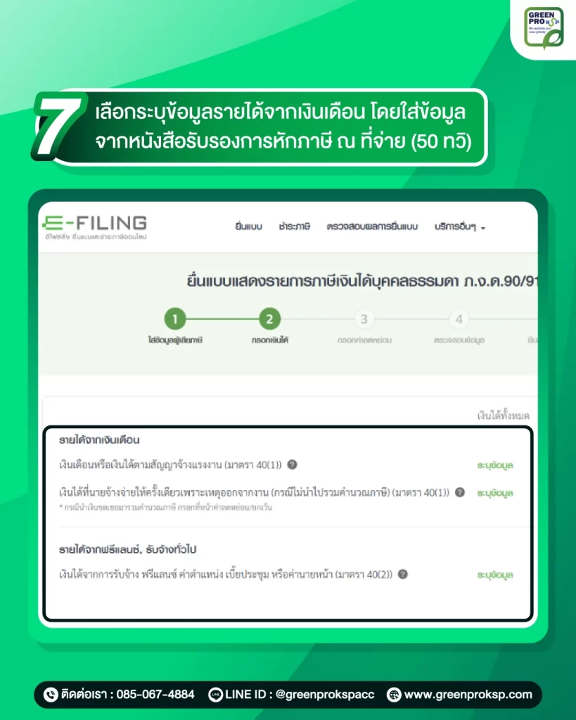1. เลือกระบุข้อมูลรายได้จากเงินเดือน โดยใส่ข้อมูลจากหนังสือรับรองการหักภาษี ณ ที่จ่าย (50 ทวิ)