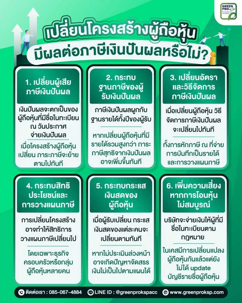 เมื่อโครงสร้างผู้ถือหุ้นเปลี่ยน การหักภาษี ณ ที่จ่ายจากเงินปันผลต้องอ้างอิงผู้รับจริง หากวางแผนล่วงหน้า ฝ่ายบัญชีจะสามารถเตรียมการหัก นำส่ง และออกหนังสือรับรองภาษีได้อย่างถูกต้อง