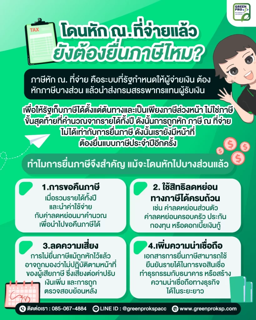 ยังจำเป็นต้องยื่นภาษี เพราะการหัก ณ ที่จ่ายเป็นเพียงการชำระภาษีล่วงหน้า ไม่ใช่การคำนวณภาษีขั้นสุดท้ายของทั้งปี